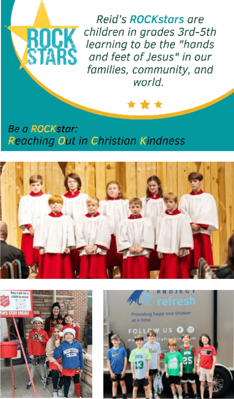 This age group is also referred to as Reid’s ROCKstars. Each month they explore how to be the “hands and feet of Jesus” in their families, community, and world. There is lots of fun to be had as these students build friendships and serve in the CSRA. During these monthly mission opportunities, they learn about the people that make up our community and how to extend the love of Jesus through service to others. Be a ROCKstar: Reaching Out in Christian Kindness!